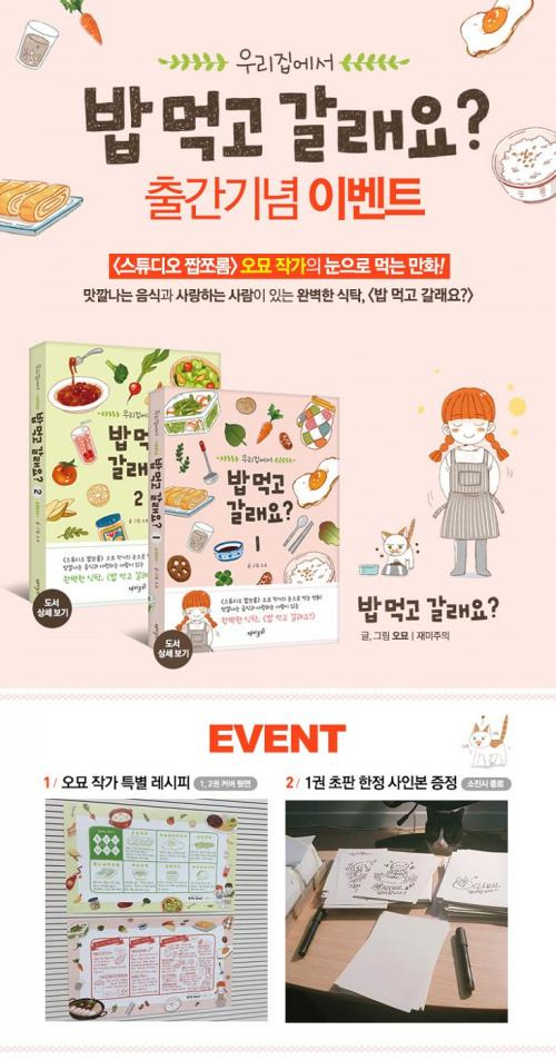 밥 먹고 갈래요? 는 우연히 웹툰 이것저것 찾아보다가 그림체가 귀엽기도 하고 음식을 소재로 한 웹툰은 왠지 모르게 끌리는 게 있어서...한 화 두 화 보다가, 너무너무 재미있어서 소장하고 싶어진 만화입니다. 그래서 1권 구매했습니다! 오묘 작가,, 그림체가... 소장하고 싶게 아주 귀엽구요, 내용도 작가님의실제 생활을 기반으로 한 생활웹툰인가? 싶을 정도로 재미있구요... 어쩌면 이렇게 다양한 음식을 소재로 해서 이야기를 그리는지, 먹음직스럽게 그림을아주 잘 그리시네요! 소장 강추합니다!